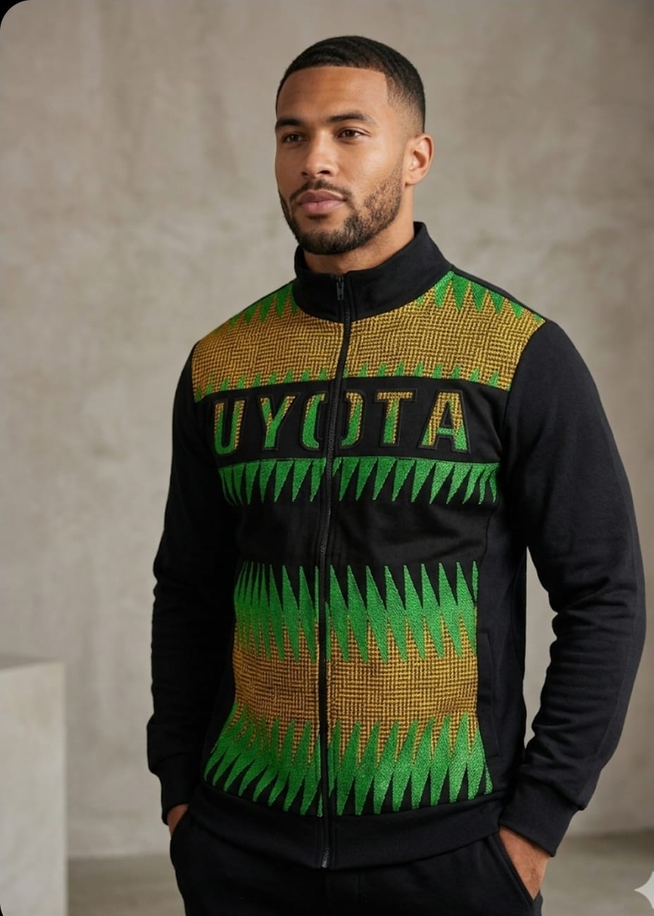 A statement in precision and heritage. The Emerald Sovereign Jacket fuses a sleek black base with commanding green and gold woven detailing, crowned by bold UYOTA signature branding. Tailored for a refined silhouette and crafted from premium fabric, it delivers elevated street luxury with undeniable presence. Built for leaders.