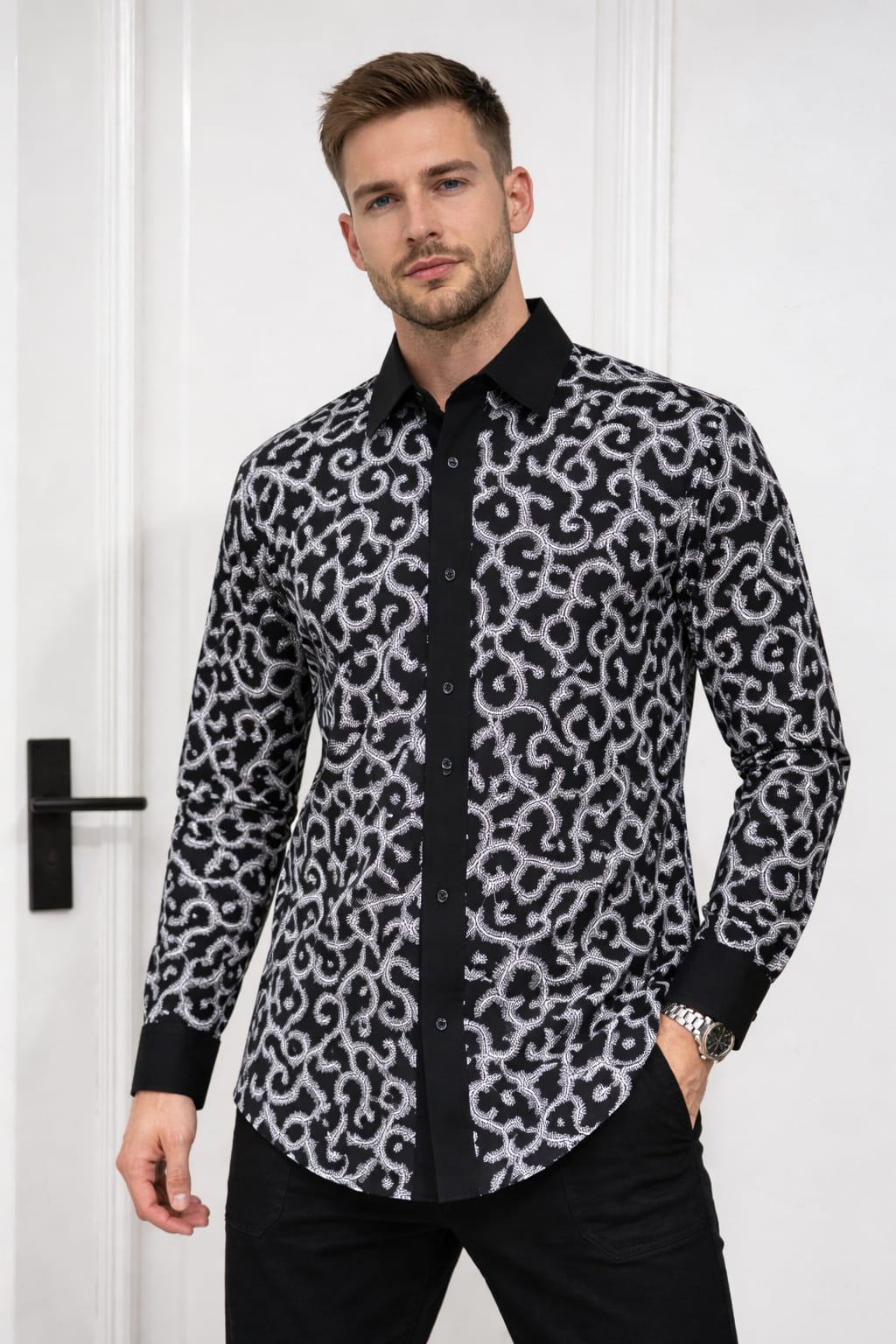 Bold. Clean. Unforgettable. A sleek black long-sleeve shirt featuring an intricate silver swirl pattern with contrast black collar, placket, and cuffs for a sharp finish. Tailored in a modern fit that moves with you — perfect for evenings, events, or standout smart-casual looks.