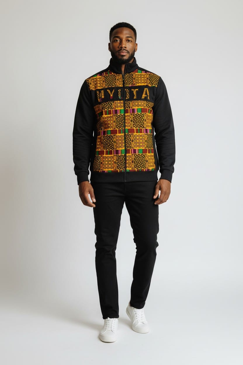 Command presence without saying a word. The Royal Mosaic Jacket blends a sleek black base with a bold Ankara-inspired mosaic panel across the chest, detailed with rich gold tones and vibrant heritage patterns. Finished with a structured collar and clean zip front design, this piece balances tradition and modern street precision effortlessly. Tailored for confidence and built for comfort, it’s perfect for elevated casual wear, cultural events, or making a statement wherever you step. This is not just outerwear. It’s identity, worn boldly.